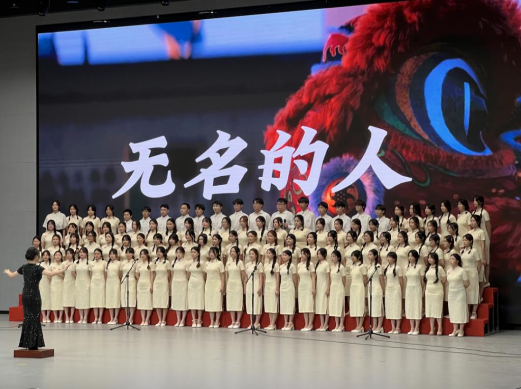 我院合唱团作为第四支参赛队伍,以《无名的人》和《玉盘》两首曲目震撼全场。首曲《无名的人》以深沉旋律致敬各行业默默奉献的无名英雄,诠释了新时代青年对平凡岗位中非凡坚守的深刻理解。曲调转换间,一首诗意盎然的《玉盘》随即流淌,通过灵动歌声展现对中国发展成就的礼赞,唱响青年学子对美好未来的憧憬与奋斗决心。