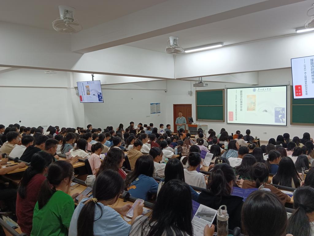 张志国博士基于自己所做的研究,围绕“《今天》杂志与朦胧诗”主题,以翔实的文学史料,细致梳理了“朦胧诗”在中国当代文学史中产生、发展、变化的全过程,对当代文学史上《今天》杂志的创办与传播、《今天》引领的新时期文学思潮、《今天》派诗人的诗歌风格等进行了精彩生动的“历史现场”复原和文学内涵解说,并高度概括了朦胧诗在当代文学脉络中的精神谱系特征。整场讲座台下座无虚席,同学们高度专注,认真听讲,不时进行笔记。