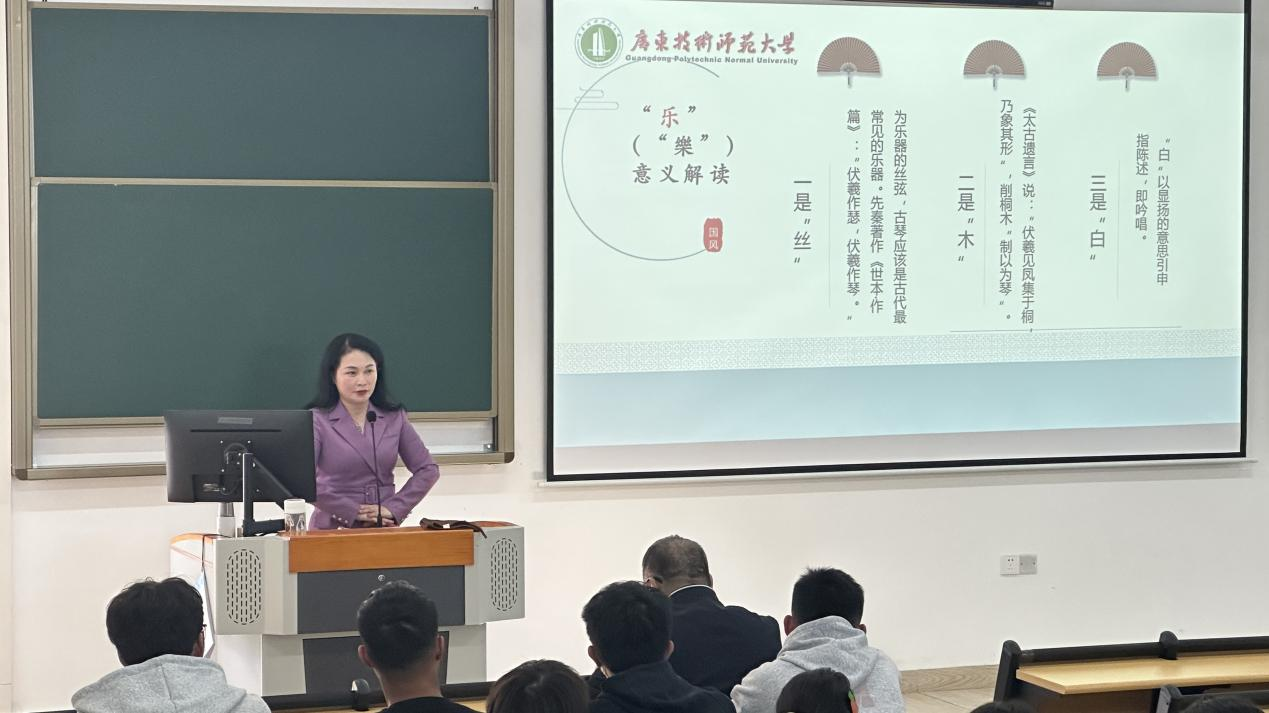 陈菊芬教授从“乐(樂)”字意义解读入手,系统梳理音乐史,通过《越人歌》、《花非花》等古诗词吟唱,带领师生进入音乐天地,共同体悟音乐之美。在对音乐,尤其是地方音乐的介绍中,陈菊芬教授系统讲述了音乐美学的宗旨,以“高贵的灵魂、高尚的道德、高雅的情趣”,总结音乐美学对于人生素养的重要意义。