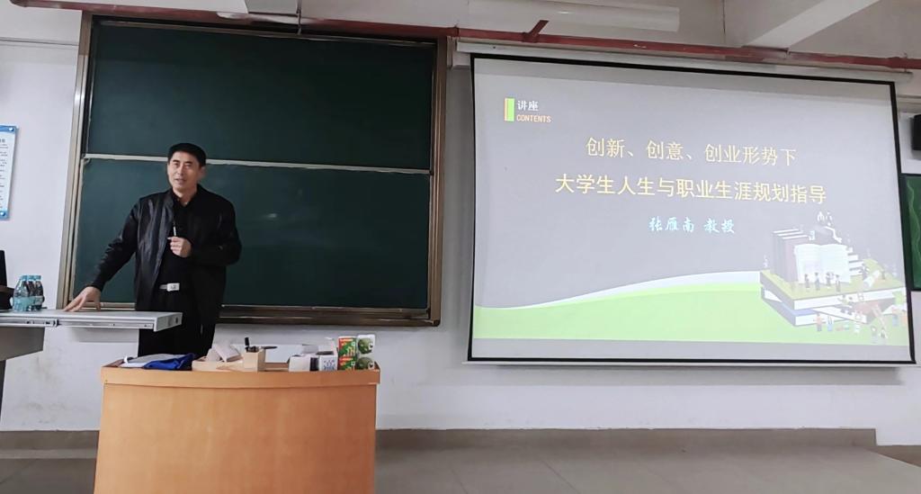 讲座伊始,张雁南教授以生动趣味的方式给同学们讲授了自身的学习经历,鼓励大家在学习中不要畏惧困难和挑战,进而从创新的角度给学生们交流学业、职业和事业这几个方面的内容。说到职业,不仅联想起当今日益严峻的就业形势,以及何去何从的问题,张教授提醒同学们在未来的职业生涯中要做到居安思危、未雨绸缪,需要有个清醒的认识且不要迷茫。我们的同学们在未来的工作选择中大多会从事与本专业相关的工作,但是也有同学会选择从事与本专业无关的工作或者继续升学考研考博等。面对这几种情况,我们需要做好自我定位,分别是:第一,在专业知识上,要有所为有所不为。比如面对现今的双减背景下,如何去培养自身兴趣,以及关注到青少年学习不良的问题。第二,在应用技能上,要艺多不压身。就好比现在广泛提出的“1+X”教育教学,需要我们广泛提升自身的能力、发展多维技能,避免形成思维定视,认为学好一门学科知识便通路无阻了,努力发挥个体能说会道、能写会画和能做会创这几方面的技术技能。第三,在继续深造上,要宽口径厚基础。打牢自身的理论基础知识,找到一个合适的领域或者切入点进行深度研究,进而增强自身的学术底蕴和研究能力。第四,在事业发展上,要创新创意。创新思维的培养需要个体自身独立思考、前瞻洞察、理性分析、判断机遇、识别重点、抓住主线、形成创新思路、方案、计划。张教授以功夫熊猫、陕西民歌剪纸、洛阳牡丹瓷、枣夹核桃、儒释道三教合一等案例介绍了“两旧化一新”的创新思维和技能。
