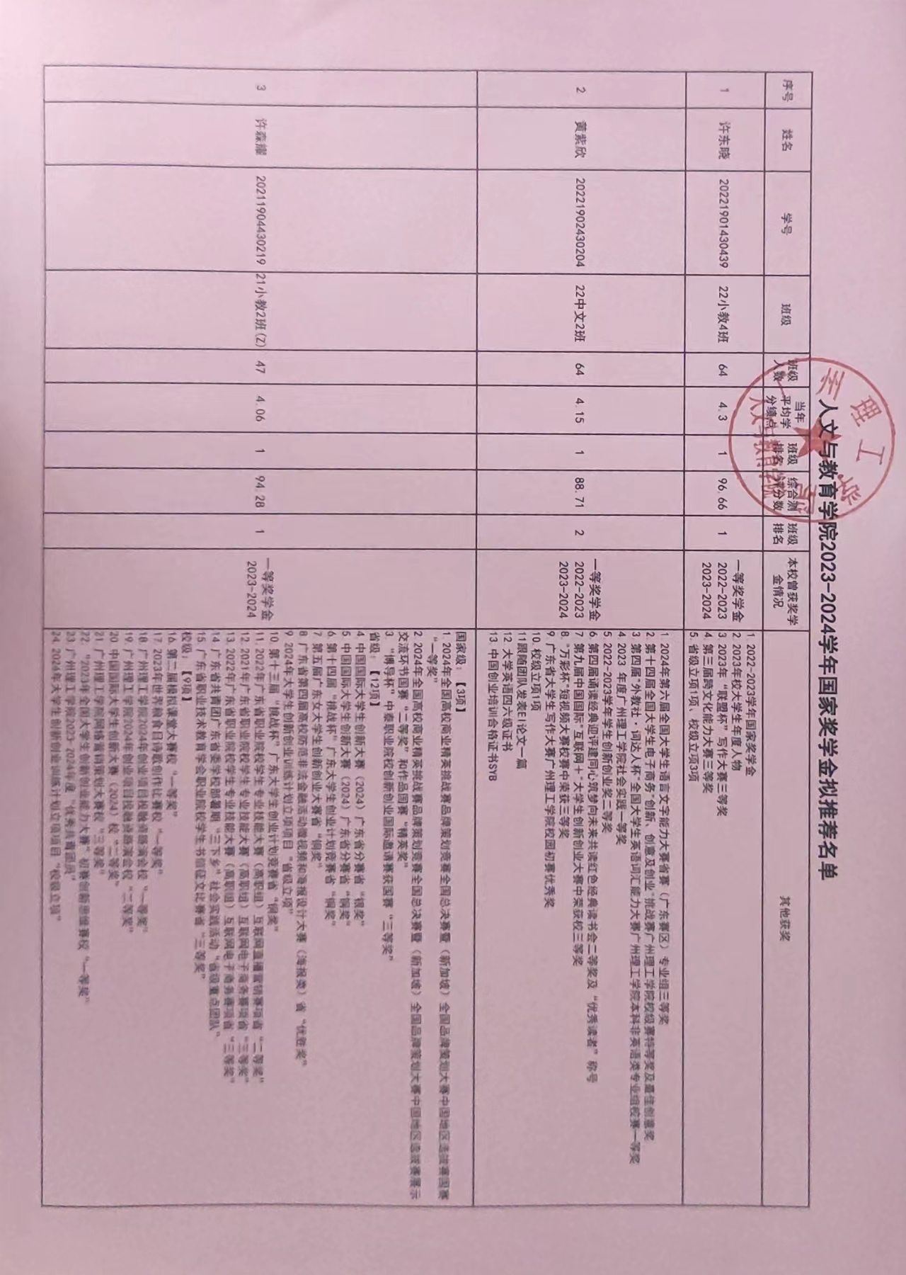 根据《2023-2024学年奖学金评比工作方案》(广州理工学函〔2024〕148号),经学生本人申请,学院评审小组评定,现将2023-2024学年国家奖学金推荐学生名单予以公示。公示时间从2024年9月27日至2024年9月29日。