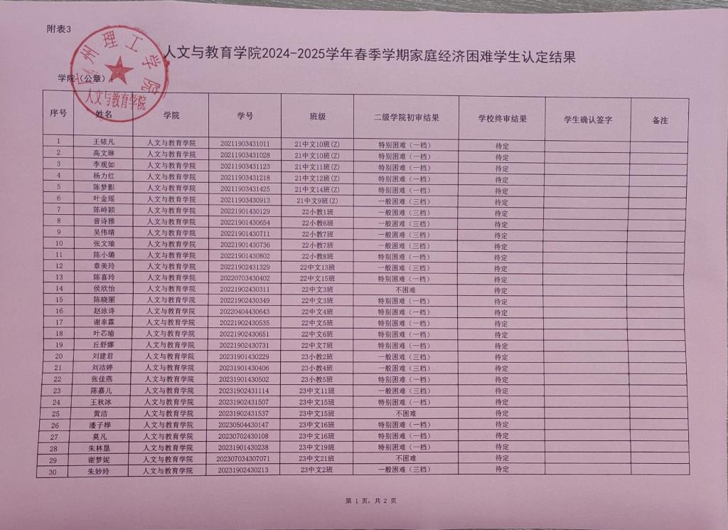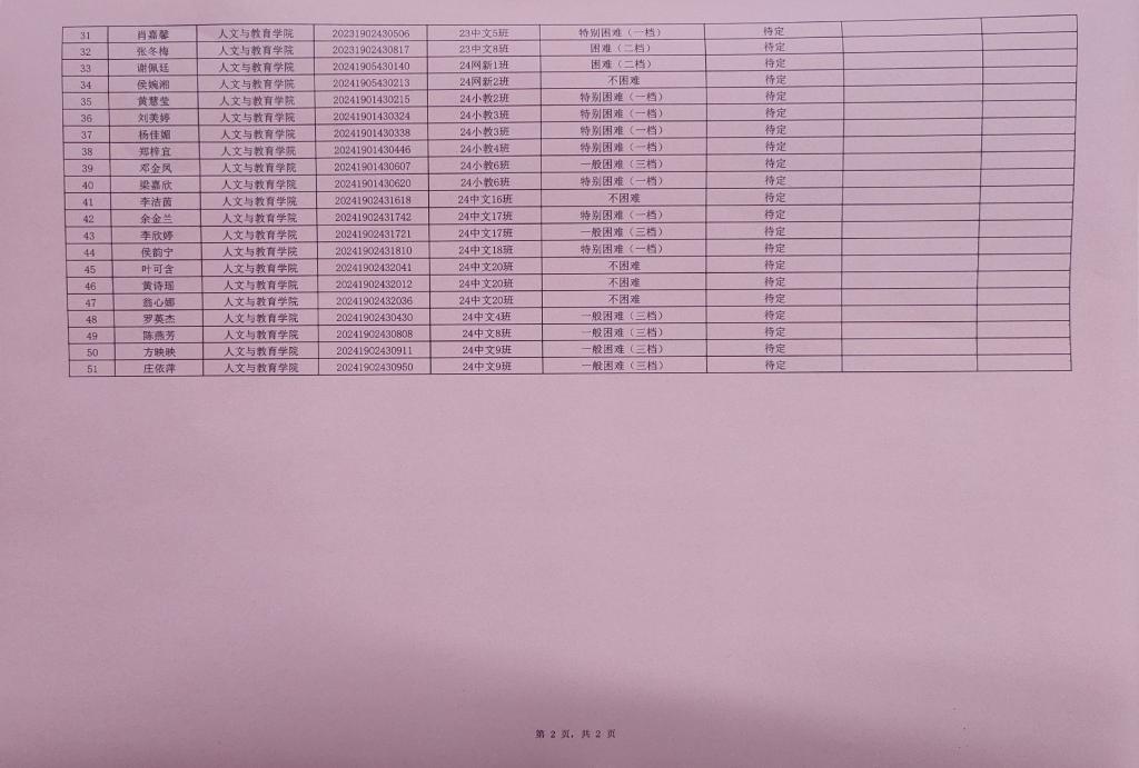 五、人文与教育学院2024-2025学年春季学期家庭经济困难学生认定结果