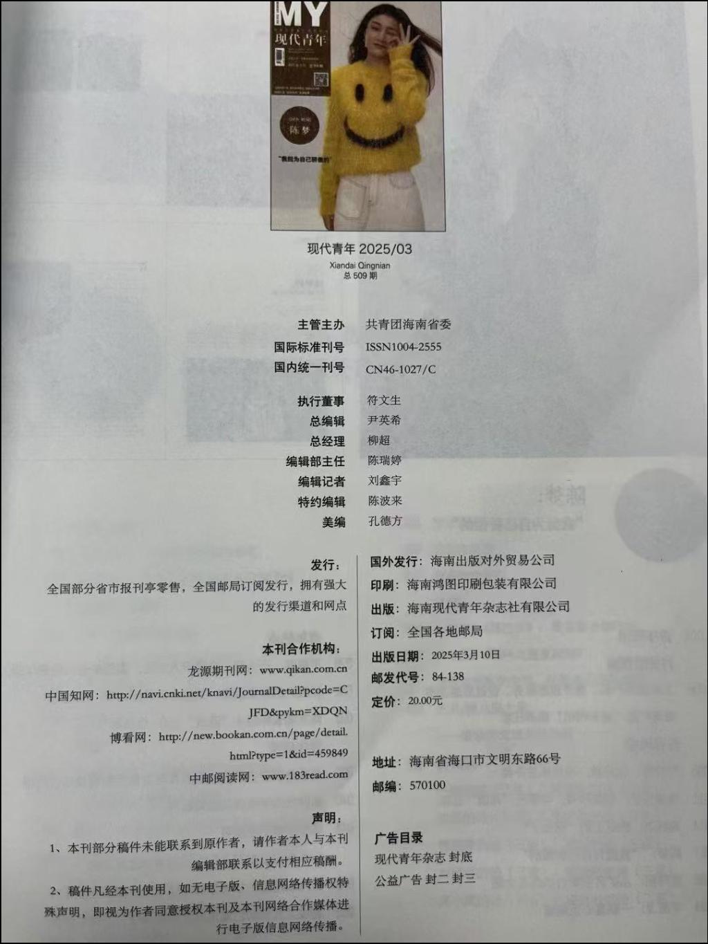 周小岚同学组诗发表于共青团海南省委主办的《现代青年》诗歌栏目(2025年第3期)