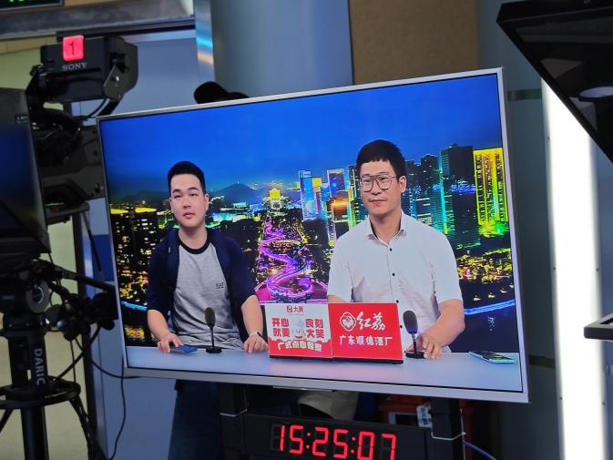 参观前,同学们先合影打卡顺德融媒。在顺德融媒一楼,徐主任热情洋溢地向同学们介绍了顺德融媒的前身,发展及主要职能。随后同学们便由卢主任和叶主任带领参观交流。参观首站,同学们被卢老师引至演播厅,这里是顺德融媒日常演播的心脏地带。演播厅内先进的设备和直播台给新闻学子留下了深刻的印象。卢主任热情地讲解导播、摄像师及主持人的工作内容,还有演播室的设施和录制流程,让新闻学子对新闻传播有了直观的认识和了解。在卢主任和工作人员的支持下,新闻学子还有幸亲自体验了一把主播的工作。