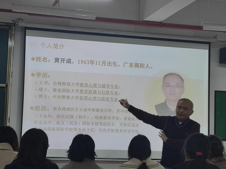 讲座一开始,黄开成博士以一个校园霸凌事件的案例引入,开门见山,问出了一个引起所有人深思的问题——“案例里学校的校长和教师的行为值得我们信任吗?”随后,在讲座中,黄开成博士以他在教育领域躬耕数十年的亲身经验,为大家讲述了如何做一位值得信任的人民教师。黄开成博士循循善诱,饱含深情,从师生信任的基础、面对校园危机事件处理态度、教师职业压力三个方面,分享了他个人深有其感的经历,激起了在场师生的共鸣。“用一颗温暖的心对待学生,即使是顽石都可以点头。”一位对待所有学生都充满爱的老师,同样能收获到来自学生毫无保留的信赖。在讲座逐渐接近尾声时,黄开成博士为在场老师与有望成为未来教师的学生们分析了教师职业压力的来源,并分享了几条缓解教师职业压力的方式。