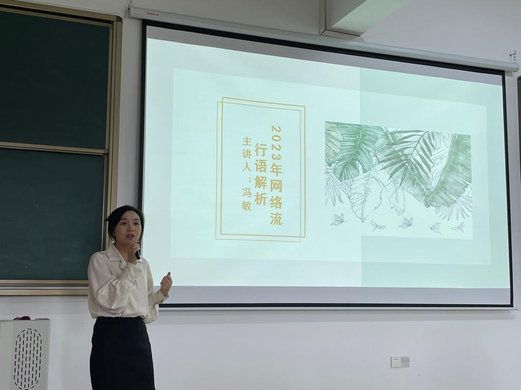 在飞速发展的现代化社会中,网络已经成为传播信息的重要途径,在网络中,新兴的词语也层出不穷,这些词语代表了人们日常关注的重点,同时蕴含了社会发展的趋势与走向,在本场讲座中,冯敏老师选取了由《语言文字周报》所统计的2023年十大流行用语——“i人/e人”“显眼包”“特种兵旅游”“X门”“遥遥领先”“多巴胺××”“孔乙己文学”“公主/王子,请××”“你人还怪好的嘞”“挖呀挖呀挖”等,冯老师首先从浅显易懂的角度出发,以自身的经历为实例,将这些与日常生活息息相关的词语总结回顾。随后,冯老师对十大流行语的来源进行探寻,使学生了解这些流行语不是凭空出现的,它们分别来自:行业用语、方言、外来词、公众人物用语、文艺与影视文学。冯老师还将这些生动例子与语言学理论相结合真正地将理论与实际结合起来,用丰富的例子向学生讲解这些词语构成的类型,如:词汇重构之混码重构类、流行构式类、语义泛化类和俗语类,使知识跃出书本。最后,冯老师向大家强调,网络用语虽然常见,但使用中还需注意使用的标准,能够长期进入词汇系统的流行语要是约定俗成的,对这类词语动态跟踪,分批规范。