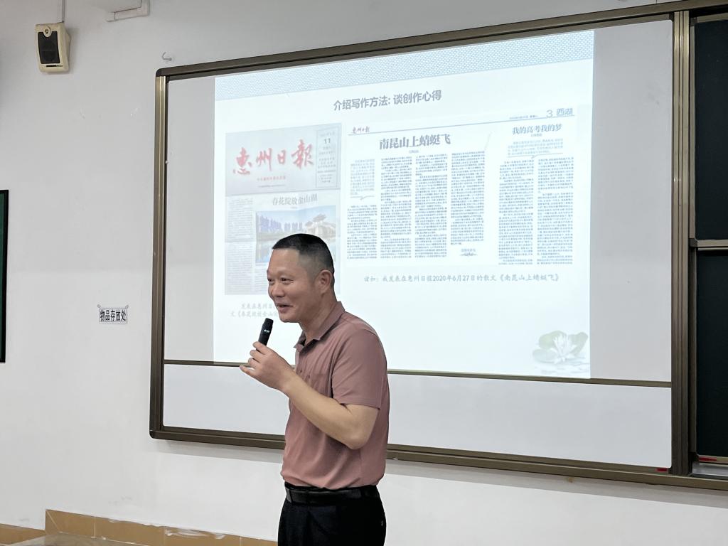 最后,周后运教授分享了“创作的积累”的三要素:生活积累、语言积累、情感积累,并以自己的文章《南昆山上蜻蜓飞》为例,讲述了自己在采访中偶见南昆山中没有蚊子,后来了解到是因为南昆山中有两千多种蜻蜓,而蜻蜓是蚊子的天敌,事后他有感而发创作的《南昆山上蜻蜓飞》在惠州日报上发表。他强调,创作需要长期的积累和沉淀,需要不断地学习、思考和实践。他鼓励同学们多阅读、多写作、多思考,通过不断的努力和积累,提高自己的文学素养和创作能力。