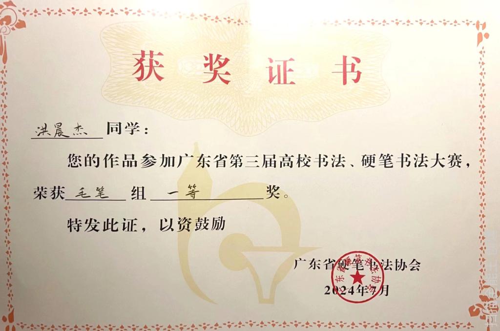 近日,williamhill中国官网洪晨杰同学(2021级机械设计制造及自动化1班)在广东省第三届高校书法、硬笔书法大赛中荣获毛笔组一等奖。指导老师是人文与教育学院的陈华老师。