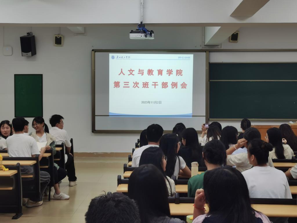 2023年11月2日,为推动学院“三全育人素质教育周”工作顺利进行,人文与教育学院于20时30分在7栋418教室举行“三全素质周”工作布置会,会议由陈新喜老师主持,全体辅导员及各班班长、纪委和学委参加。