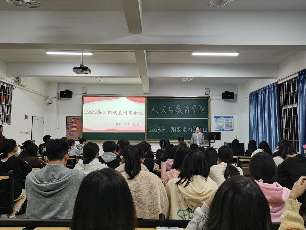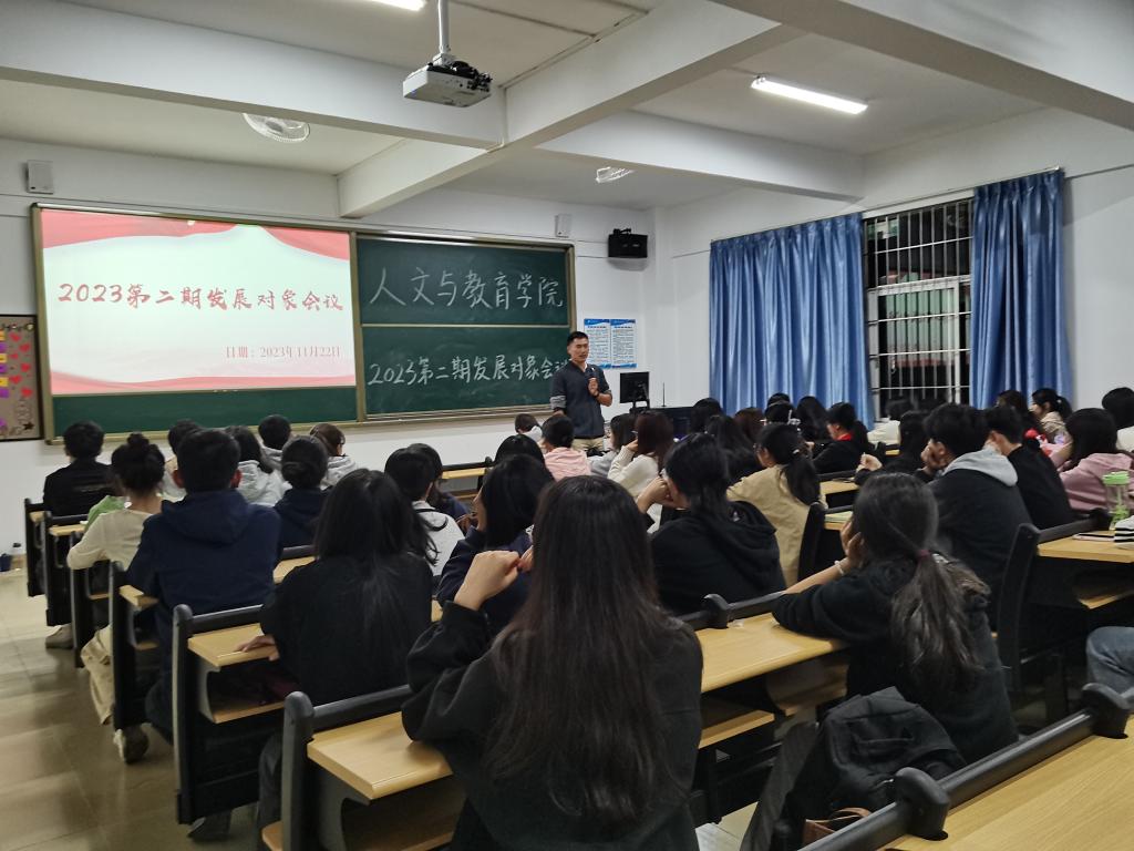 为了提高我院党员发展对象的素质和能力,帮助他们进一步端正入党动机,坚定入党信念,从而保证学生党支部党员队伍的质量,人文与教育学院于11月22日晚20:30在7栋402召开“2023年第二期发展对象会议”,我院党总支书记刘亮、学生党支部书记王倩,以及77名发展对象参加本次会议。