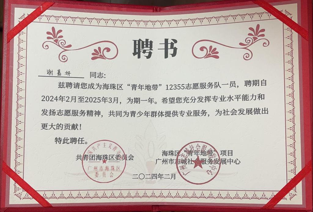 我院谢嘉妍老师受聘为该志愿服务队心理咨询师,负责共青团广州市海珠区委员会青年地带12355护苗行动中的青少年心理援助服务,包括个案分析、团体辅导、科普讲座和心理咨询。