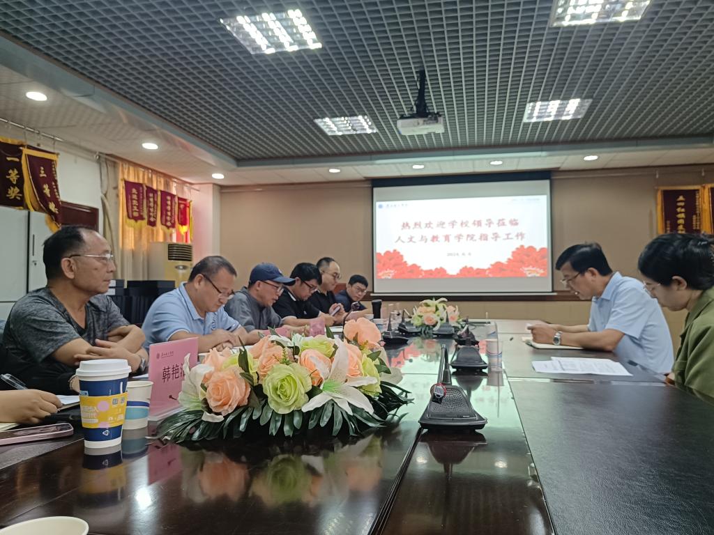 2024年6月6日,副校长黄南松、学校办公室李兆俊老师到访人文与教育学院,就学院十项标志性成果执行情况进行调研,人文与教育学院院长周卫忠教授、副院长陈南先教授、副院长杨东博士、文学系主任韩艳洁、教育系主任黄静、副主任于智慧、传媒系副主任吕齐无尘、帽峰学者张学松教授、院长助理朱文亮博士以及办公室主任代婵参加了此次座谈交流会。