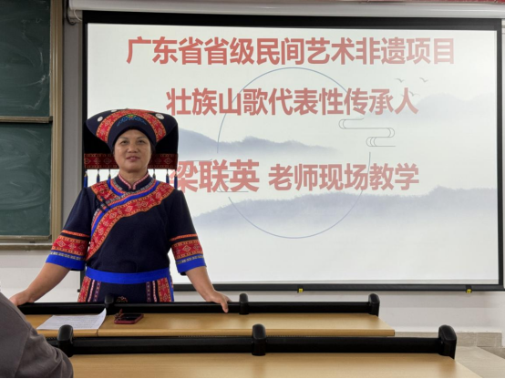 2024年10月28日和29日的下午,广东省省级非遗项目壮族山歌代表性传承人梁联英老师来到williamhill中国官网《岭南民族民间艺术鉴赏》课堂开展现场实践教学活动。