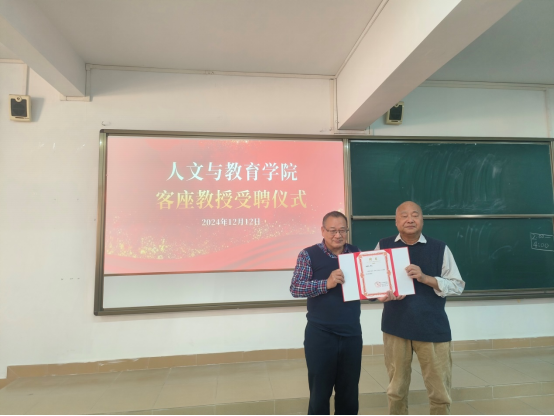 讲座伊始,陈南先副院长代表人文与教育学院为段益民教授颁发了客座教授聘书。段教授是广东技术师范大学文学与传媒学院教授、硕士研究生导师,该校引进的首批博士,师从语言学大师邢福义先生。研究领域是语言学和逻辑学,发表论文专著八十余篇(部),曾获广东省“南粤教书育人优秀教师”奖和全国第十八届田汉戏剧奖一等奖。
