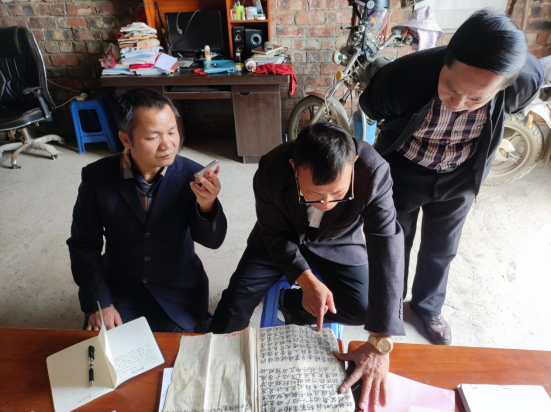 在壮族的民间信仰中,巫师的角色尤为关键。他们被当地人称为“麽公”或“道公”,是连接人与神、沟通天地的重要媒介。课题组在田阳拜访了当地知名的道公向少贤,他同时也是壮族歌圩(田阳敢壮山歌圩)的自治区级传承人。向少贤详细介绍了道公文化的起源、发展及其在壮族社会中的功能,并现场演示了念咒施法的传统仪式。他向课题组展示了珍贵的麽经抄本,部分抄本已有近百年的历史,记录了丰富的咒语、仪式和民间故事。此外课题组还翻阅了本地歌圩的歌本,进一步了解了壮族山歌与宗教文化的内在联系。