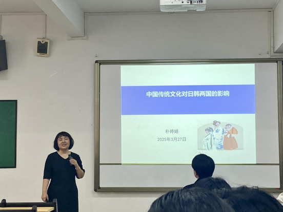 两个小时的讲座,仿佛刹那间就来到尾声,知识的洗礼总在时间悄悄然的流失当中完成。在对演讲主体——中国传统文化对日韩两国的影响——充分地论述过后,朴教授把演讲的视角转入了当下,她在更加广阔的时代背景下延伸这一课题。当今时代,中日韩三国在亚洲文化圈中应当更加紧密地联系,共建东亚文化圈,而这一跨国文化理想的实现,则有赖于场下的年轻学子。中日韩三国有深厚的文化渊源,“山川异域,风月同天”,朴教授的讲座将给青年学子们带来更多更深刻的思考,也将让人期望习近平总书记所说的“人类命运共同体”的实现。
