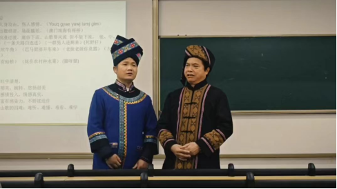 讲座主讲人覃祥周先生(右)与覃守达教授(左)现场合作演唱山歌