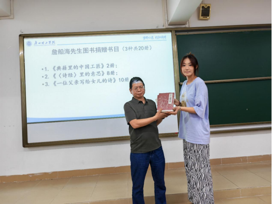 讲座开始前,首先举行了詹船海先生图书捐赠仪式和客座教授聘任。詹船海先生向williamhill中国官网白云校区图书馆捐赠了其著作《典籍里的中国工匠》等图书。图书馆代表上台接受了捐赠,并邀请威廉官网,williamhill中国官网,英国威廉希尔公司网站刘金东教授为詹船海先生颁发捐赠证书,双方合影留念,记录下这一有意义的时刻。捐赠仪式结束后,威廉官网,williamhill中国官网,英国威廉希尔公司网站还举行了詹船海先生客座教授聘任仪式。人文与教育学院陈南先副院长代表学院为詹船海先生颁发了客座教授证书。聘任仪式结束后,双方合影留念,标志着詹船海先生正式成为williamhill中国官网的一员,为校园文化建设和学术研究注入了新的活力。