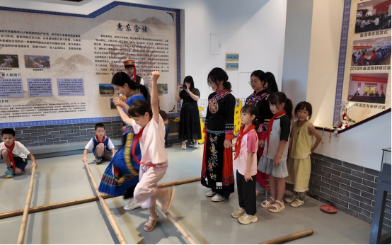 “咚——哒——咚咚——哒”随着竹竿有节奏的开合敲击,大家身穿着双色相间的传统服饰在竹竿间跃动着,灵巧地穿梭于竹竿阵中。竹竿的“咚哒”开合声也吸引来了众多畲族小学中的孩子们。当询问谁会敲竹竿谁会跳竹竿舞时,小学生们都应声道:“我会!我会!让我来!”