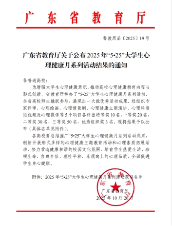 近日,由广东省教育厅指导主办的“5·25”大学生心理健康月心理剧评选活动圆满落幕。人文与教育学院心理情景剧《心灵出租屋》凭借深刻的主题立意、真挚的情感表达与精湛的舞台表现,从全省百余所高校的参赛作品中脱颖而出,荣获三等奖。该剧由人文与教育学院吉嘉琦老师、校心理健康教育与咨询中心夏靖慧老师共同指导,创作先锋工作室成员韩乐怡、郑苏雅、黄思盈、郭晓晖、陈圳苗、程晓玲、吴菲凤、陈婷婷、陈锦莲联合创作。