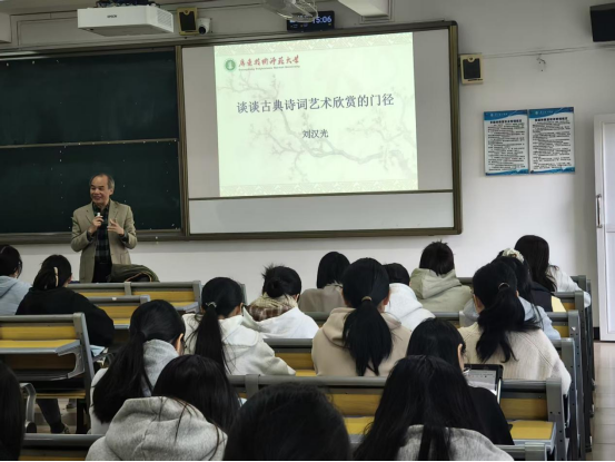 整场讲座内容丰富、逻辑清晰,既有理论高度,又有实例支撑。刘教授语言风趣、引证广博,更以深情的诵读将文字化为音声,让古典诗词在讲堂中“活”了起来。现场掌声不断,互动踊跃。讲座结束后,同学们纷纷表示,不仅对古典诗词的欣赏方法有了系统认识,更在声音与意象的交融中,真切感受到中华诗词的永恒魅力。