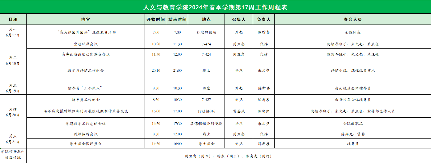 人文与教育学院2024年春季学期第17周工作周程表