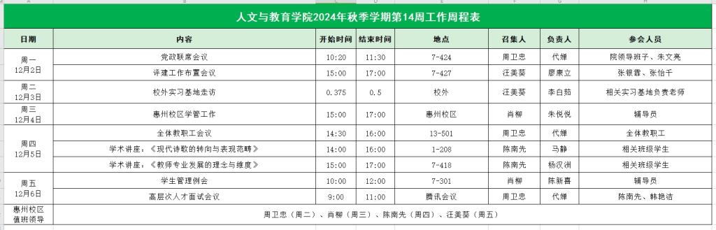 人文与教育学院2024年秋季学期第14周工作周程表