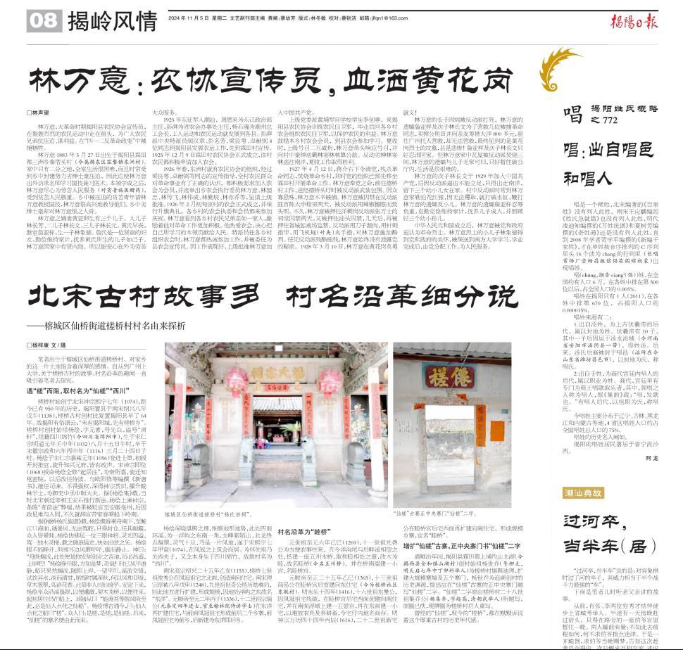 2024年11月5日,我院21中文6班(Z)杨梓康同学在《揭阳日报》第8版“揭岭风情”栏目发表题为《北宋古村故事多,村名沿革细分说——榕城区仙桥街道槎桥村村名由来探析》的文章。